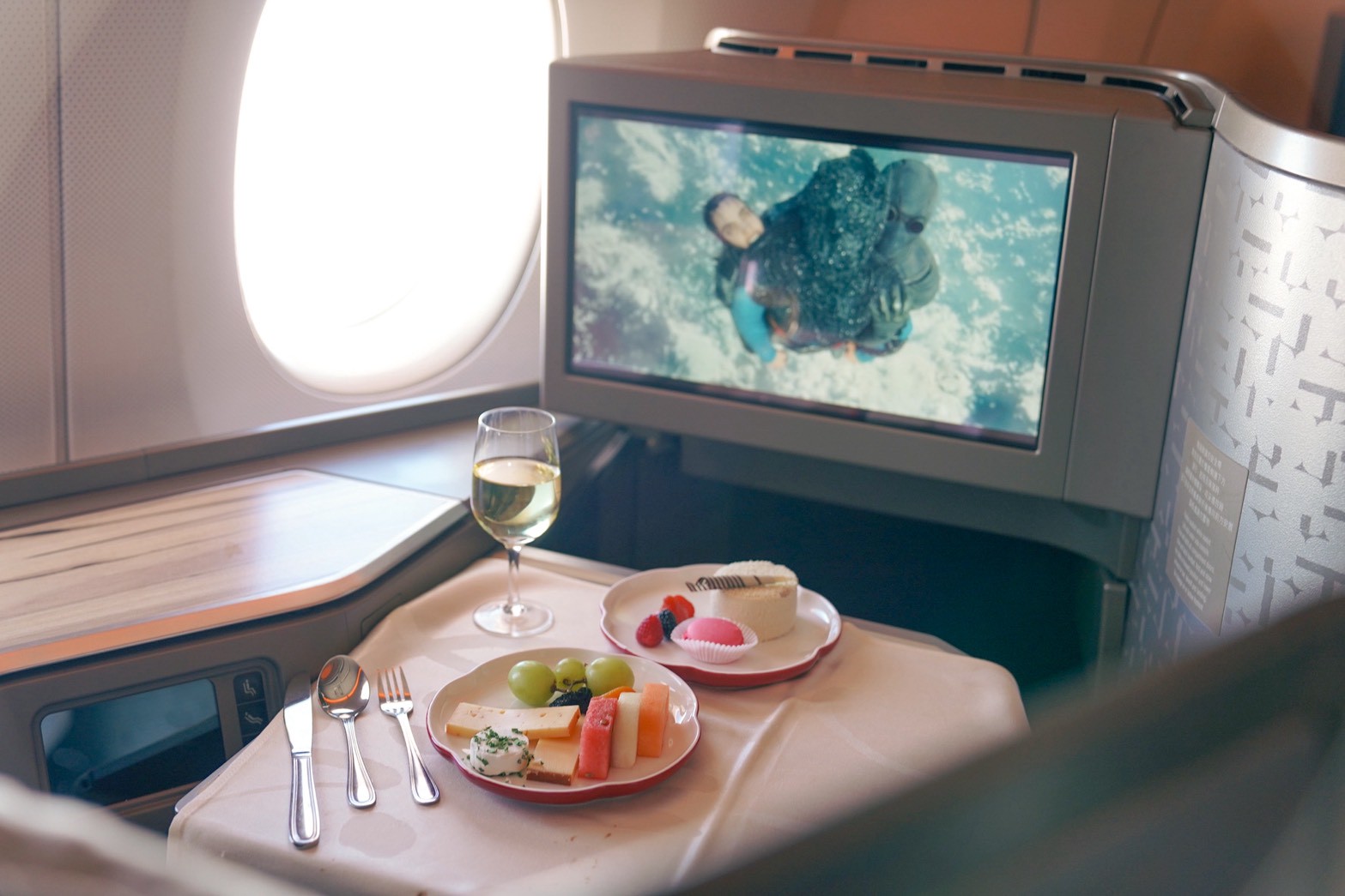 會來沙羅峰賞花健行的大多是住在附近的居民,因此山頂布置了許多戶外健身設施,儼然是座提供給居民們運動強身的健康公園。公園正中央有座觀景涼亭,原來濟州島的隱藏版賞櫻角度就在這涼亭上,一整片櫻花在眼下燦爛漫開,前方便是藍得柔美的大海,海上緩慢前進的白點即是開往濟州港的船舶,景致開闊動人。