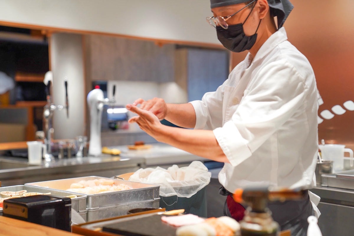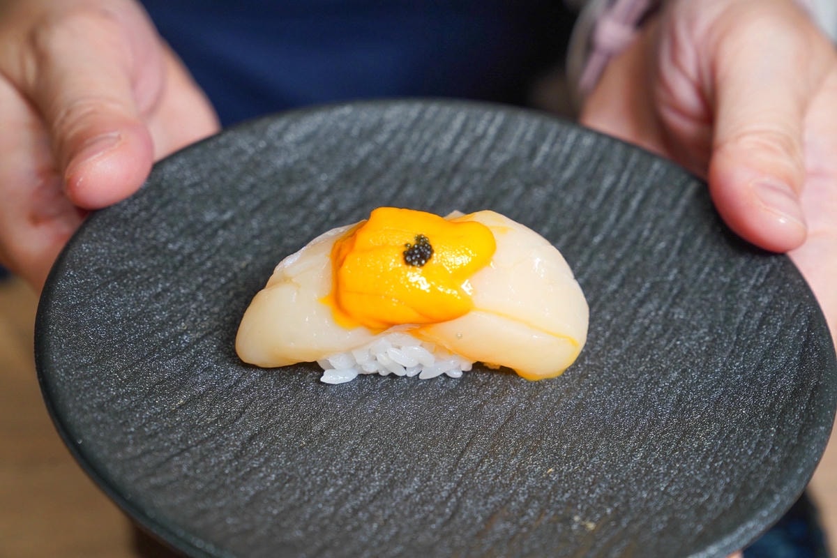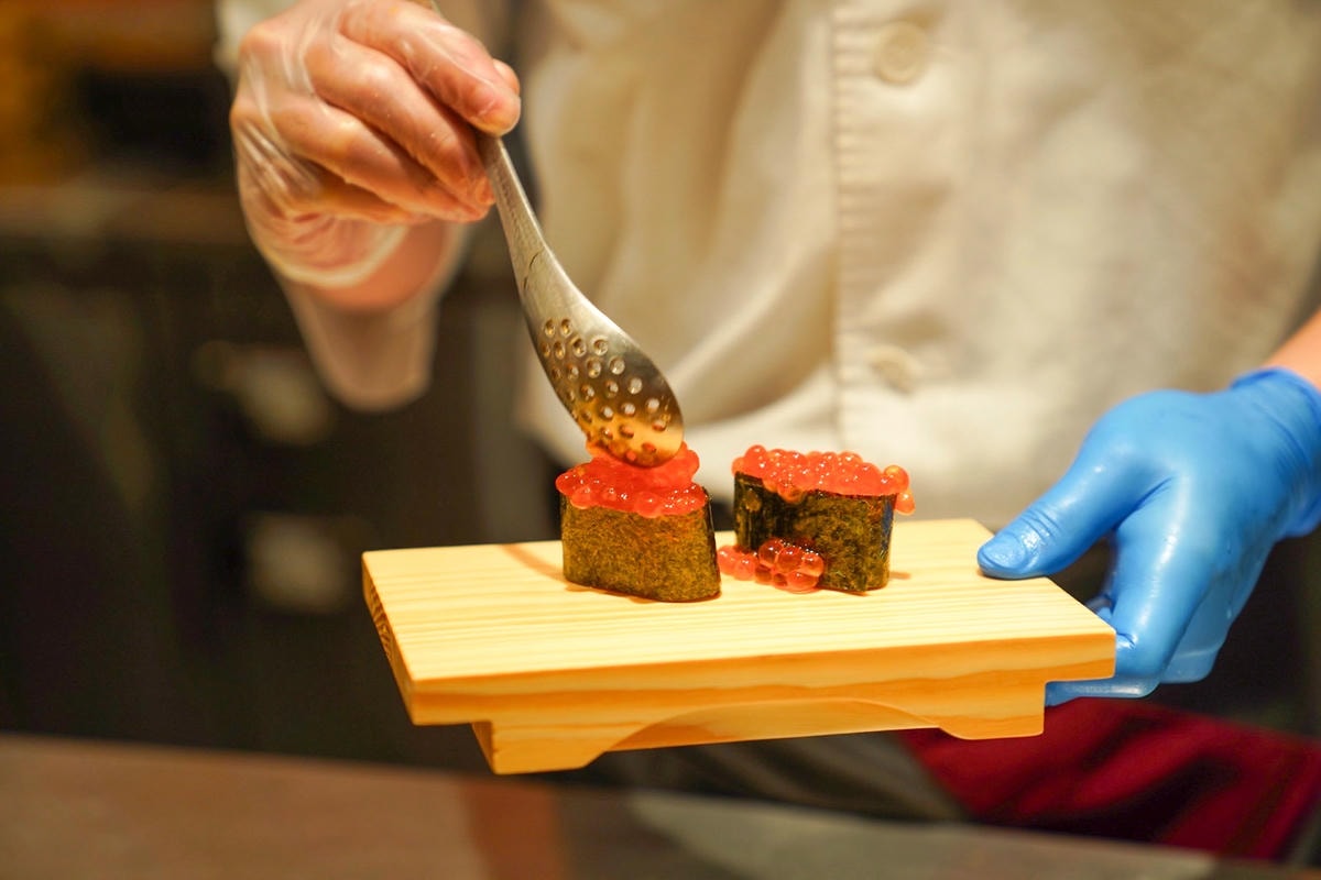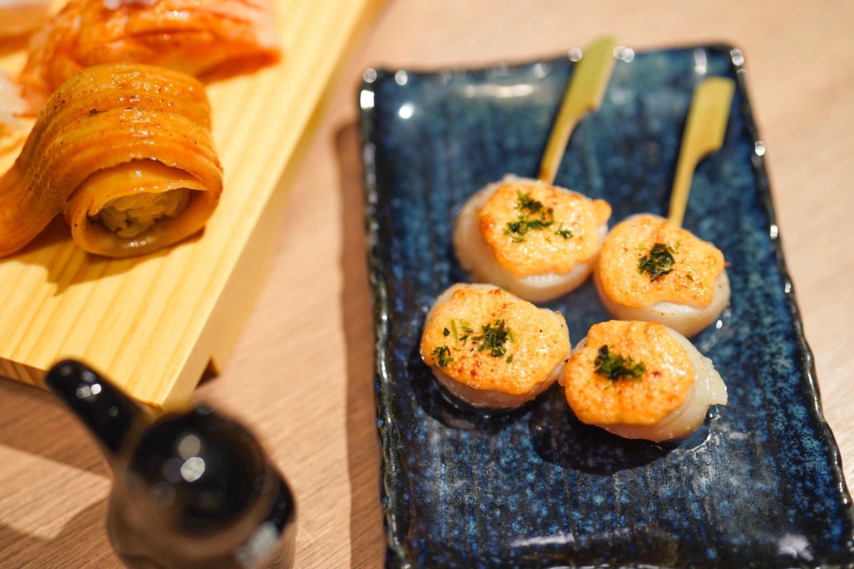 除了獨立景觀座位區、一般座席,店內的板前座也很有人氣,可以近距離觀看職人處理食材、捏製壽司的過程,鮪魚、干貝、甜蝦有條不紊的擺放在木盒裡,看那個光澤感就知道非常新鮮,不時還有炙燒壽司的火光,非常具有臨場感,「不只是職人在板前現做的握壽司,其他像是炸物、烤物等選擇超過百樣,生啤、清酒、Highball給它點下去,很有居酒屋氣氛。」來吃過的朋友推薦,除了對壽司的評價很高,更盛讚媲美居酒屋的豐富菜單。