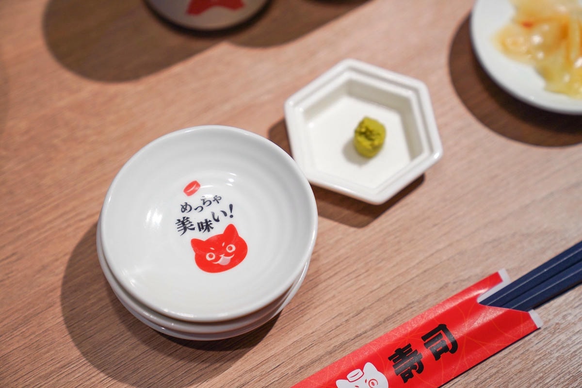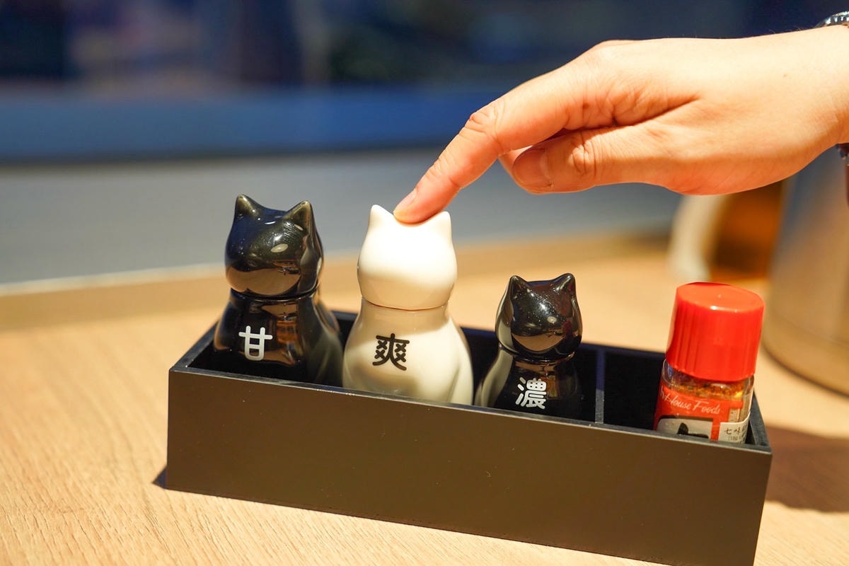 「好可愛的醬油罐!是貓貓。」桌上裝醬油的「貓醬」是兩黑一白的貓咪造型,分別是甘醇醬香的甘口、輕盈帶有茶豆風味的爽口,以及尾韻富有黑豆甘醇的濃口,可自由沾食,為生魚片、壽司等餐點增添更多層次的風味變化。