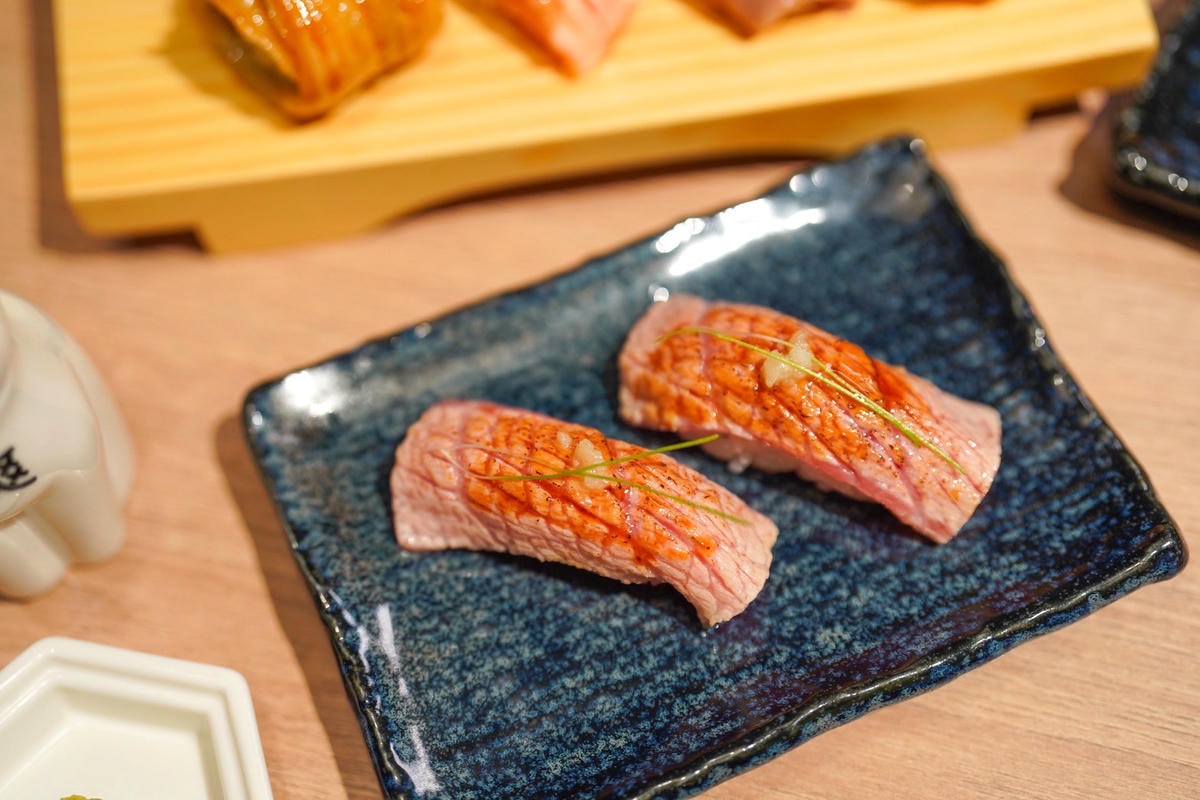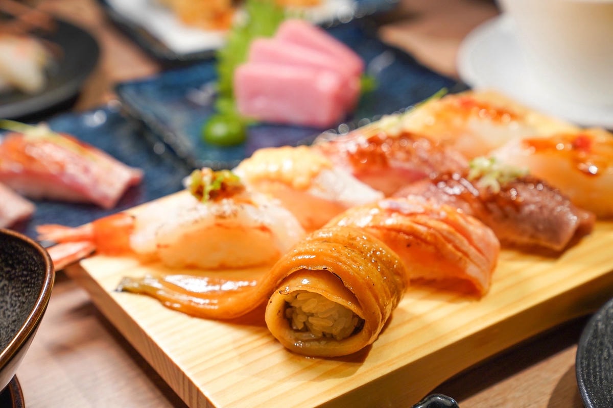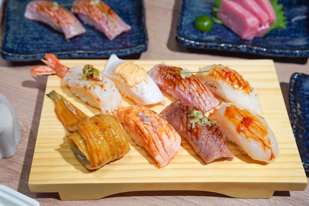 壽司類的我們點了好多種類,因有人不敢吃生的,於是點了一份有8貫的上品炙燒握壽司盛合,有牡丹蝦、鮭魚、A5和牛、黑鮪、干貝等,其中包含我最愛的星鰻壽司,好大一片捲裹著壽司飯,醬料甜甜的,一口吞下超滿足。