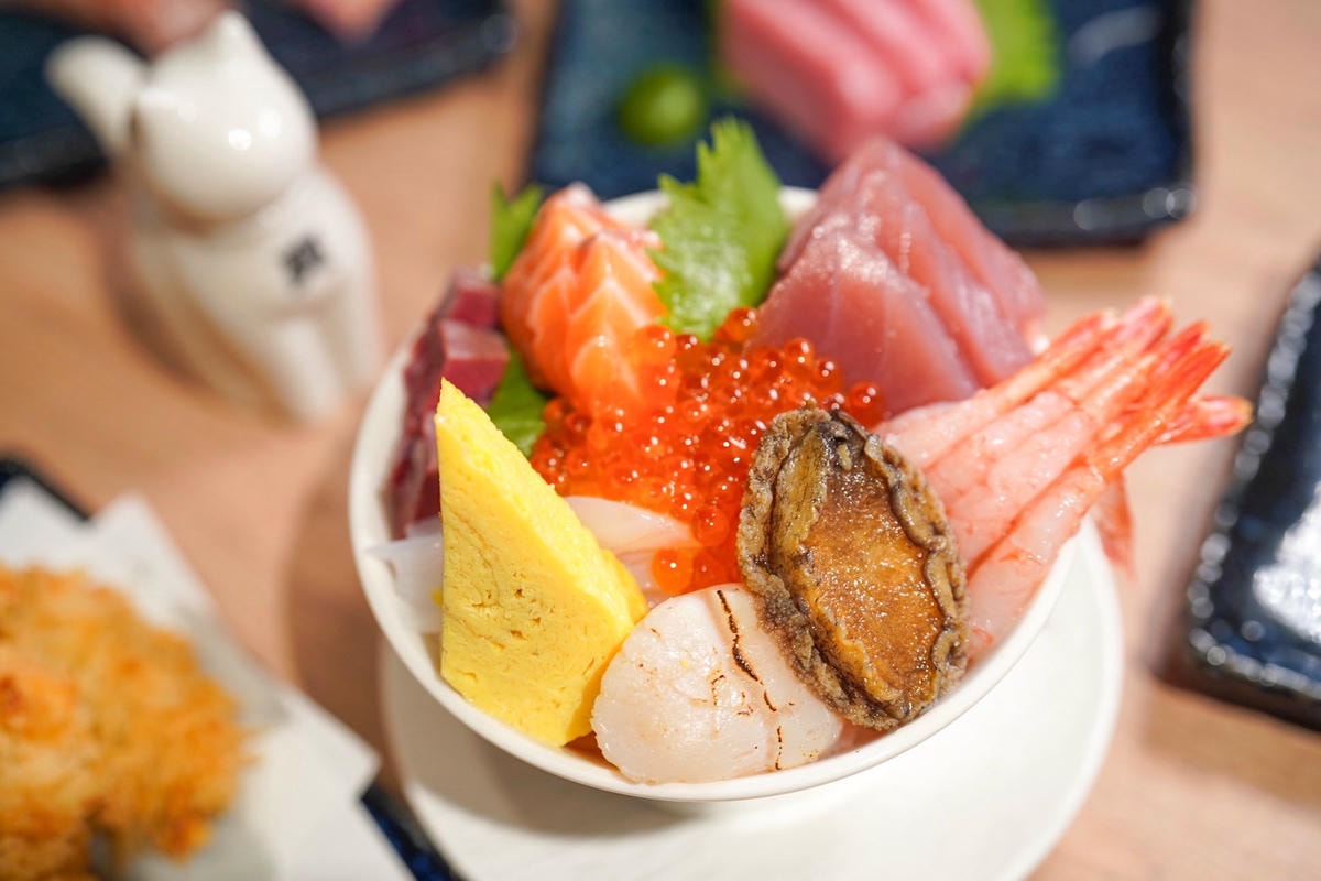 以招牌必點的華麗綜合海鮮丼來舉例,鮑魚、甜蝦、干貝、鮭魚子、鮭魚片等好料鋪滿滿398元,海鮮的份量比飯多,大家分著吃不佔胃。