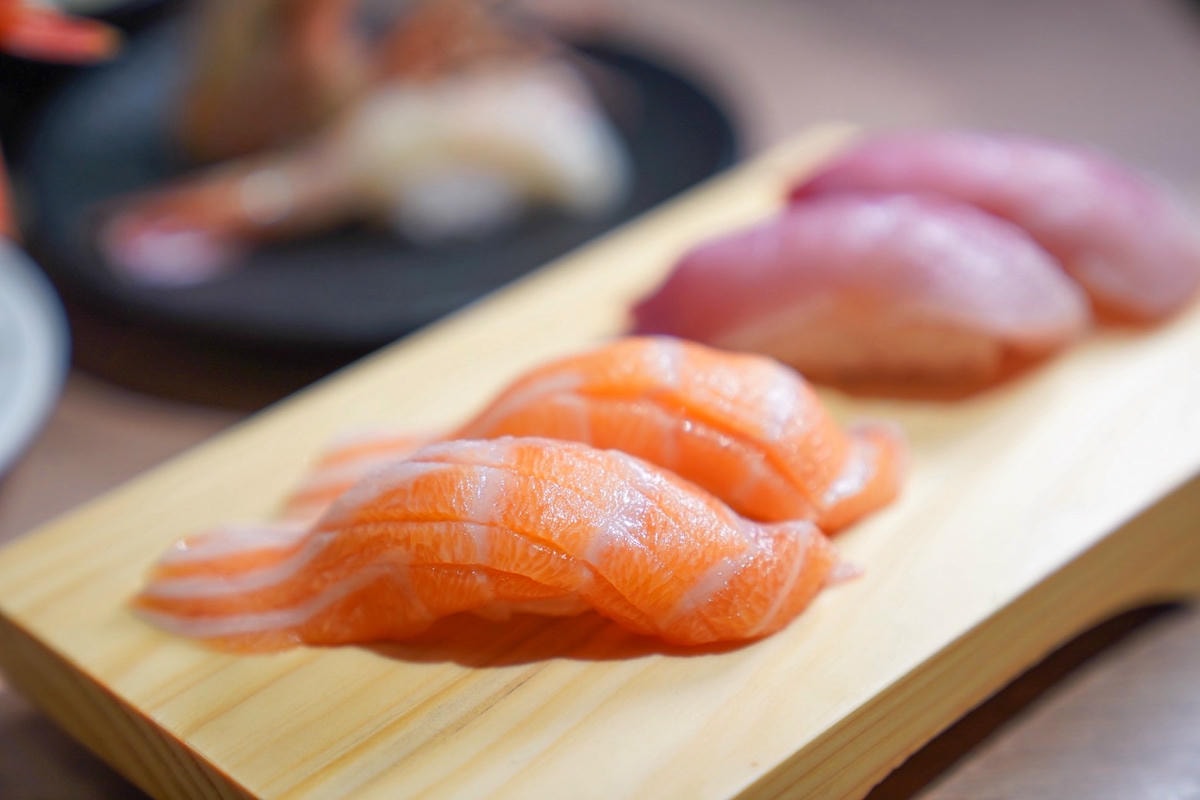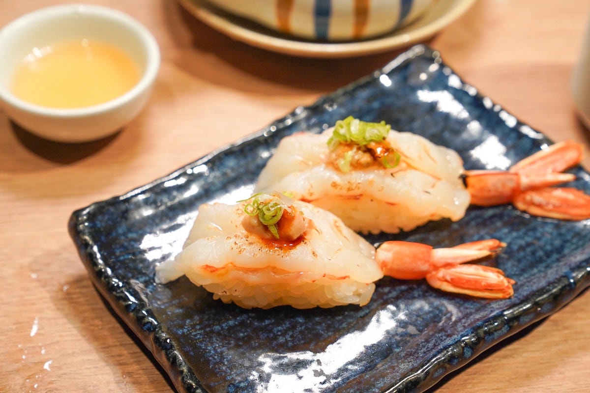 來都來了,我們決定繼續給它點下去,像是炙燒黑鮪魚中腹握壽司、北海道牡丹蝦握壽司,以及價廉物美一份有兩貫的鮮選鮭魚腹握壽司、青魽握壽司等。