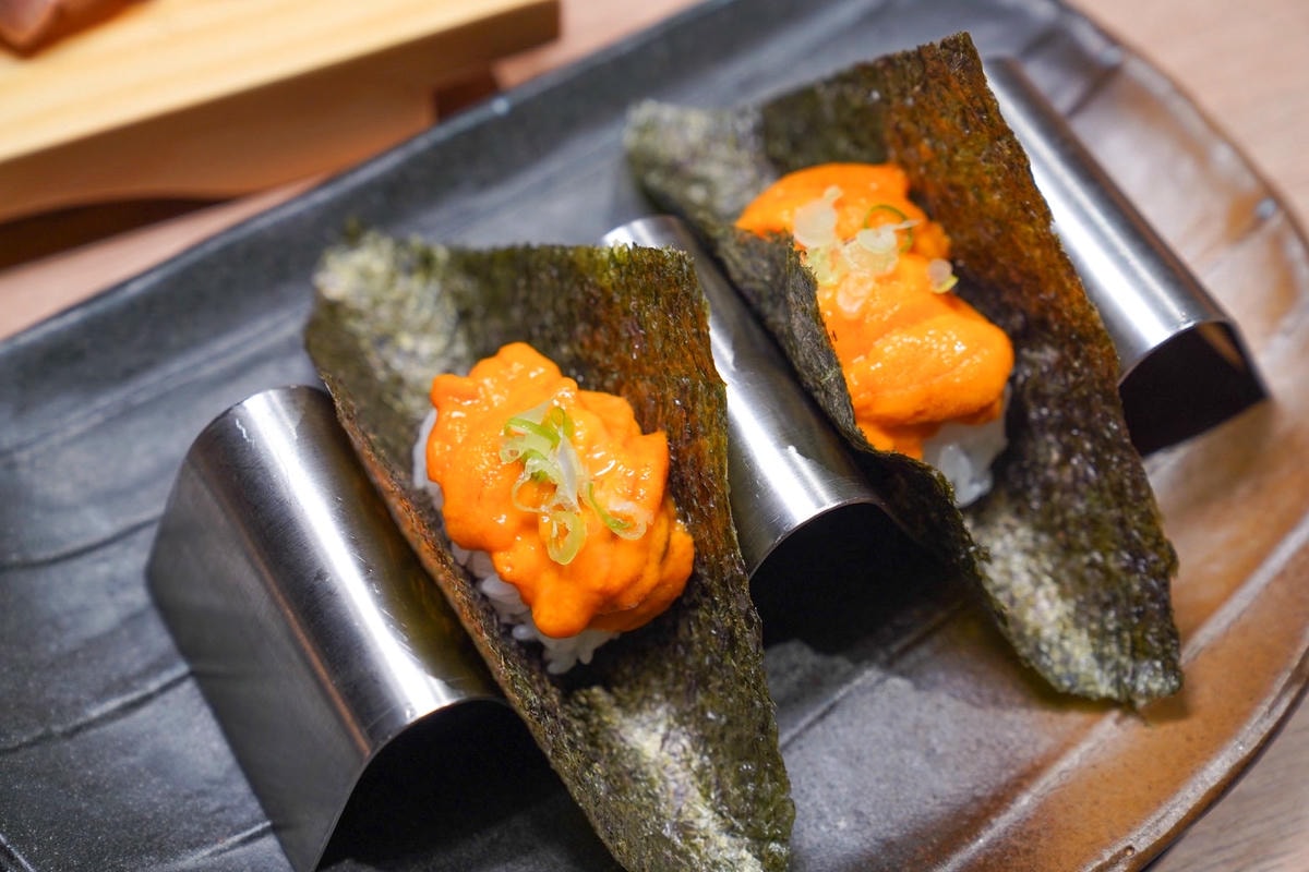 單點的有招牌貓將壽司,北海道生食級大干貝上點綴了海膽及黑魚子,多層次的鮮味在舌尖綻放,貓將壽司的海膽完全沒有那種保存味,簡直像剛剖出來的,問店員才知道是日本空運的馬糞海膽,忍不住再點了用海苔包的馬糞海膽手捲,爽脆的海苔襯托出海膽的鮮甜,幸福到我望著窗外的101夜景傻笑。