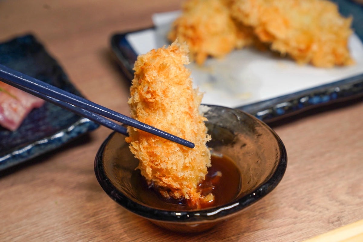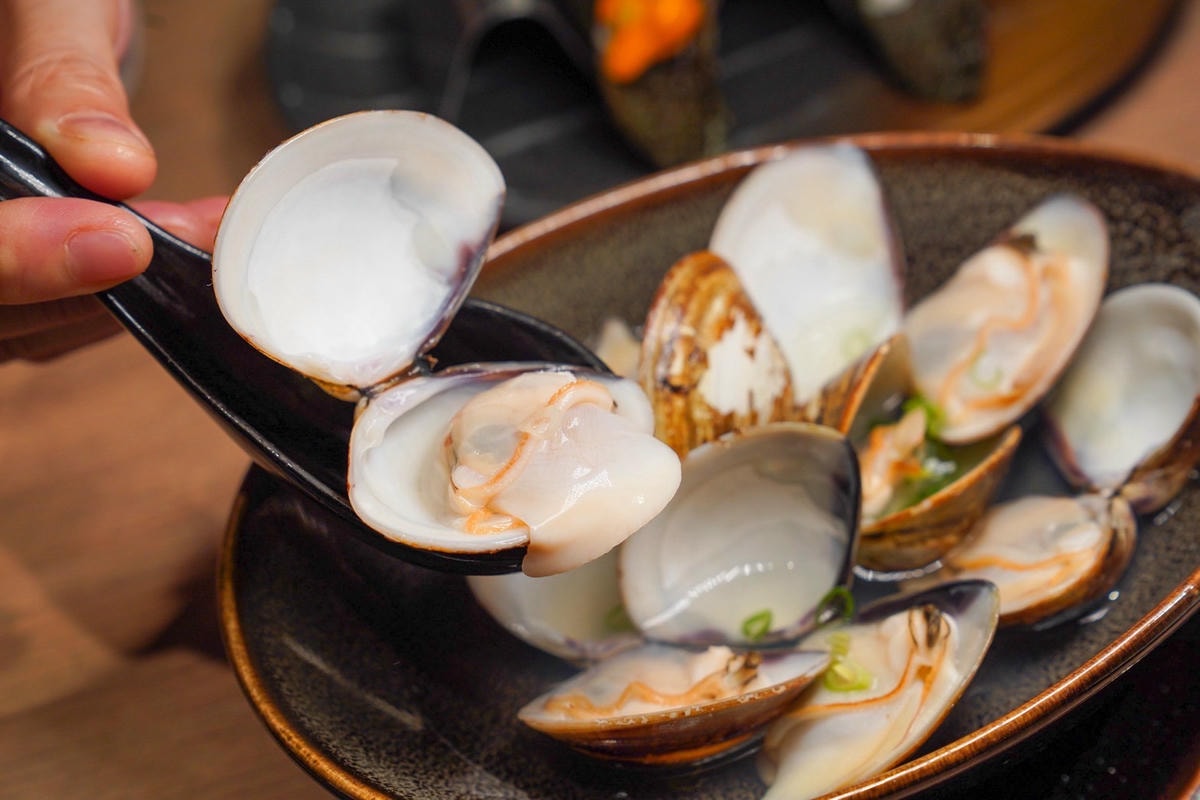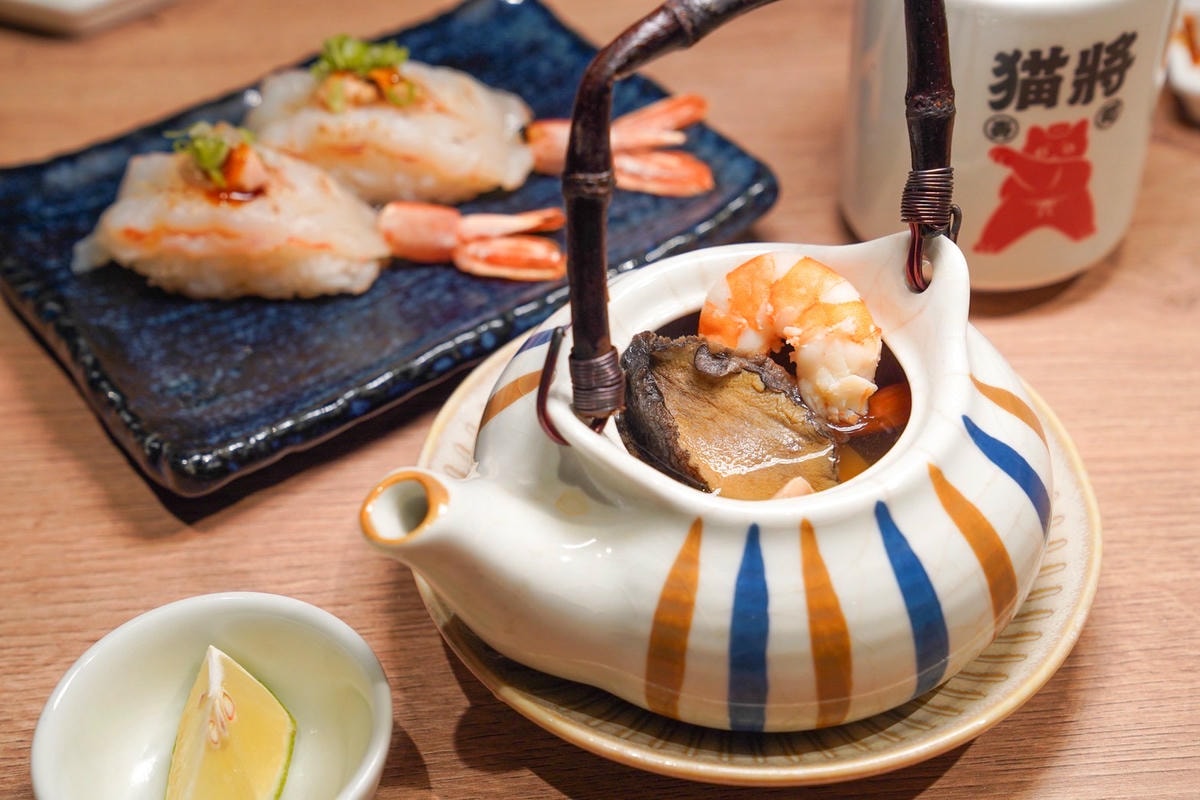 我們壽司類就點蠻多,因此在燒物、揚物等居酒屋餐點上有稍稍克制一些,一份有兩串共4大粒的極上明太子干貝串,以及肥美的酥炸日本廣島牡蠣,熱呼呼上桌正好平衡握壽司,看了網友推薦點了鮑魚土瓶蒸,以及個頭碩大鮮美的鮮蒸蛤蜊,正統的日式風味讓人有一秒到京都的感受,精緻的食器鋪陳出會席料理般的和風感。