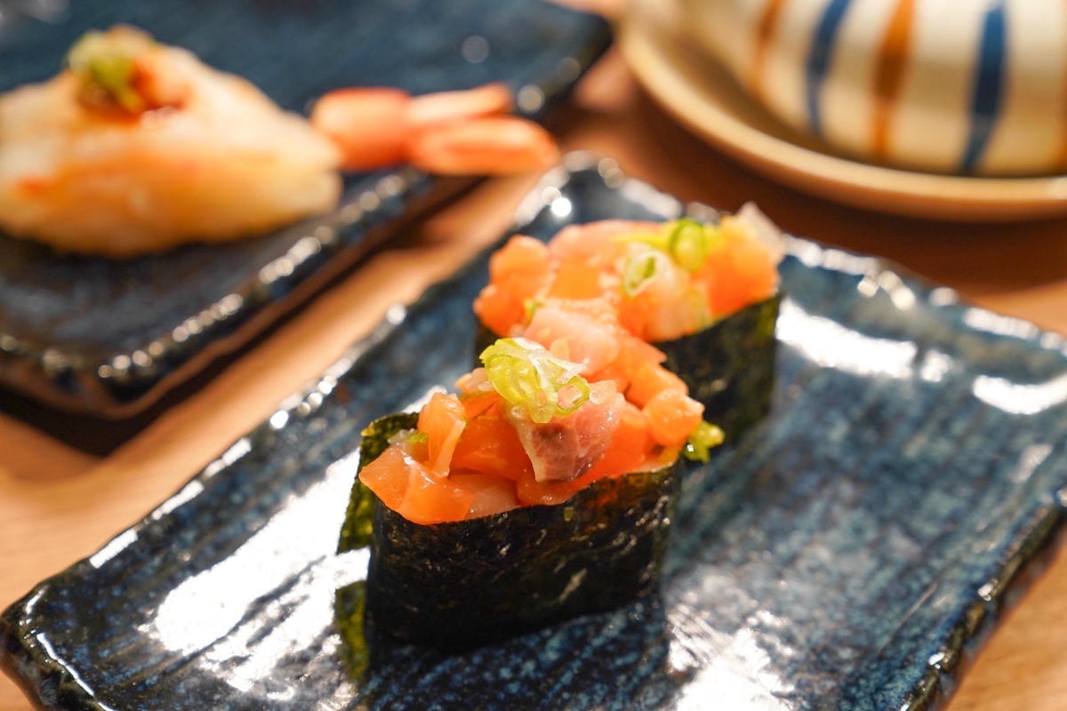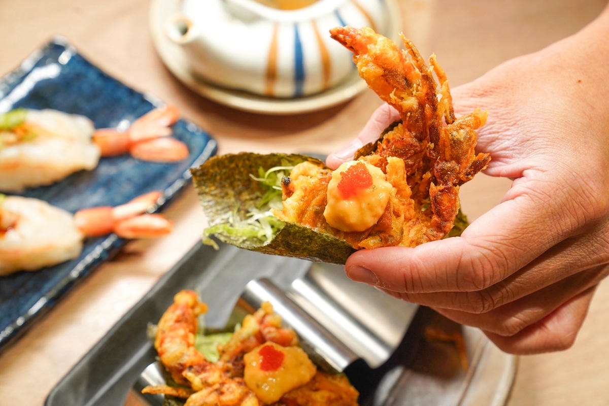 尤其是平板點餐上有「主廚推薦」標記的都想點來嚐嚐,特上滿溢軍艦像是堆覆著生魚片海鮮塊的珠寶盒,咔滋軟殼蟹手捲酥香酥香的,蟹肉和沾著魚卵的特調醬料超合拍,底下則是清爽解膩的生菜絲。此外,必點炙燒鱈魚肝赤蝦握壽司,鮮甜彈Q的赤蝦上淋了點特製醬汁,再加上鱈魚肝增添軟滑口感,一同入口的感覺好幸福;雙鮭酪梨起司加州卷裡的起司有著柔潤的奶香,咬下去時鮭魚子的鮮甜汁液噴發,和鮭魚、酪梨捲在一起吃簡直是絕配!就這樣,我們敞開脾胃盡情的在壽司的美味大海裡悠遊。