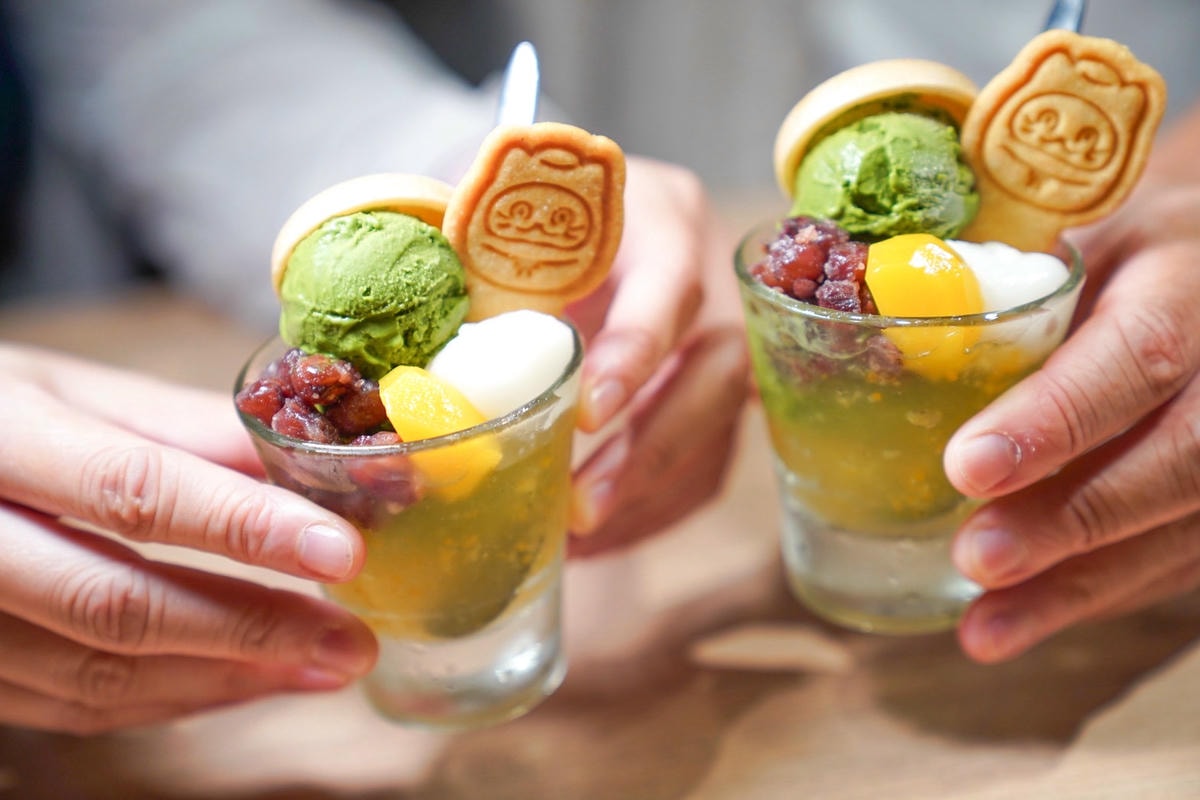 都說甜點是另一個胃,餐後甜點忍不住一人點了一份柚香抹茶繽紛聖代,紅豆、板栗、白玉糰子,外加充滿濃郁抹茶香的抹茶最中,杯緣點綴了貓將造型餅乾,份量精緻很可以,意猶未盡加點一份黃金焦糖布丁,大家分著享用,這才心滿意足的結帳買單。