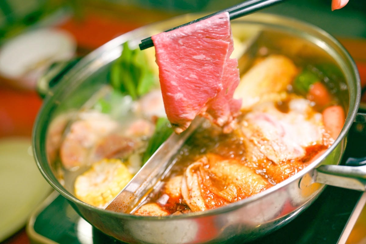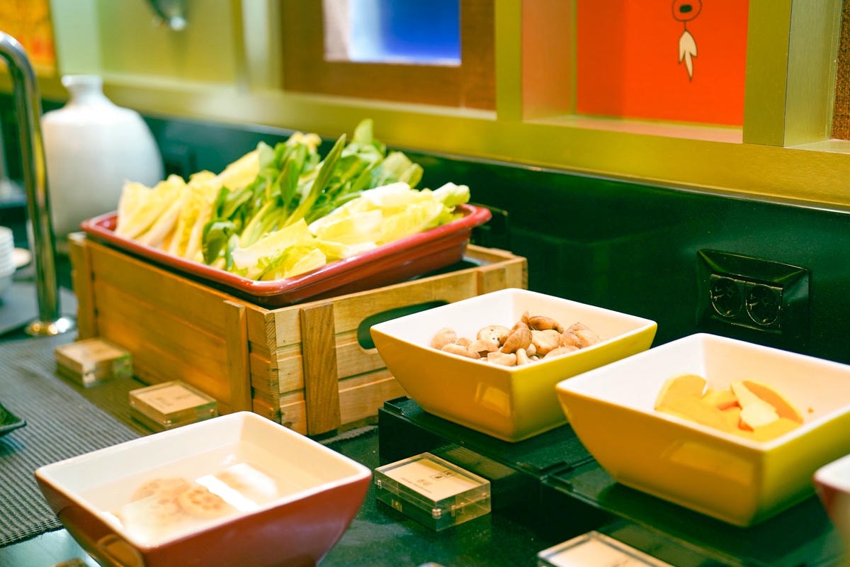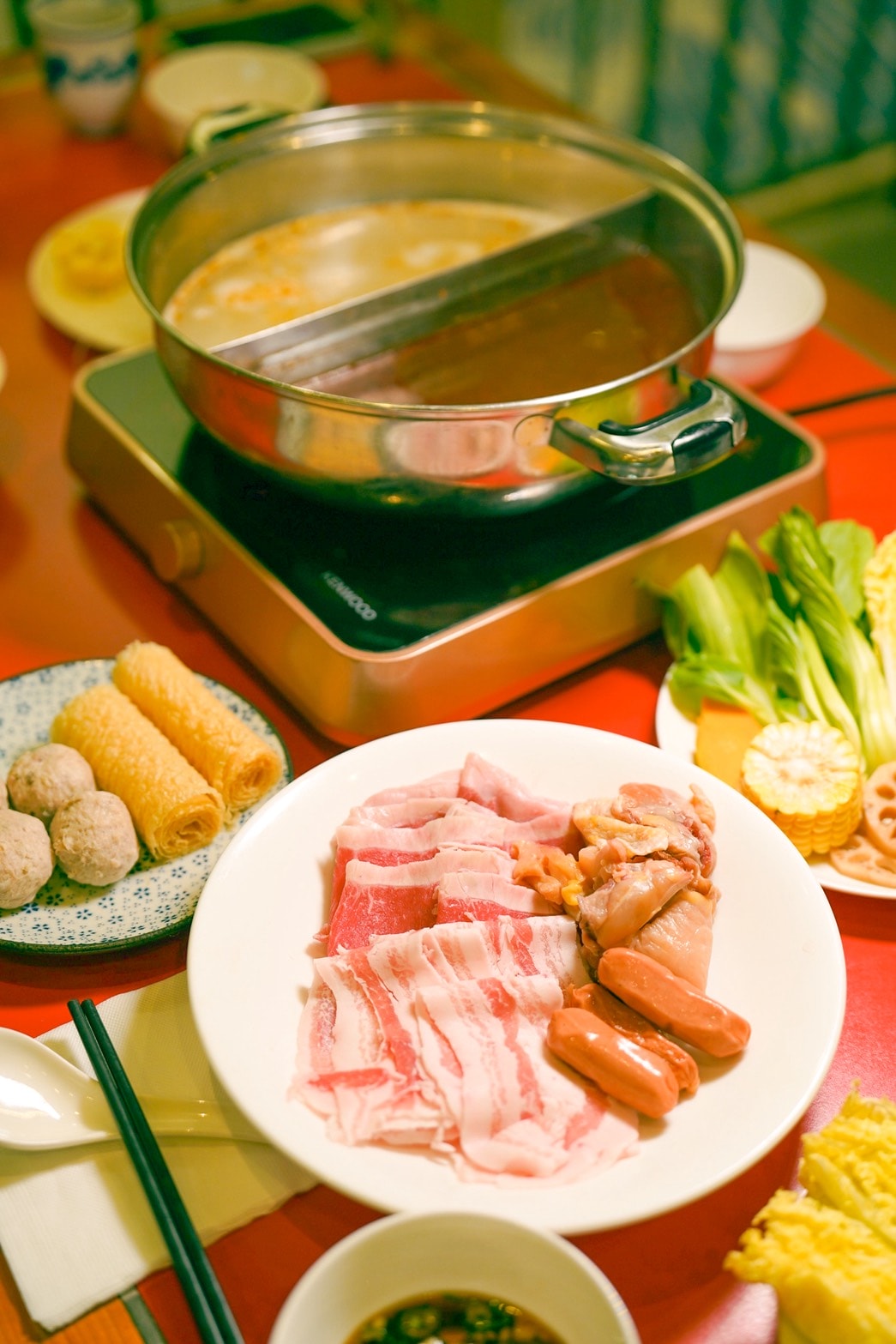 8樓的另一家餐廳「火鍋」,顧名思義就是賣火鍋的,湯頭可選辣或不辣的(川味麻辣湯、豬骨湯、香菇湯、養生菌蔬菜湯)搭在一起的鴛鴦鍋,基本消費一份套餐約1600元起,含牛肉、豬肉、丸子、香腸、炸豆皮等,菜盤和粉絲無限量供應,且不用每個人都點一份套餐,也就是說,花1600元可一桌多人分食。