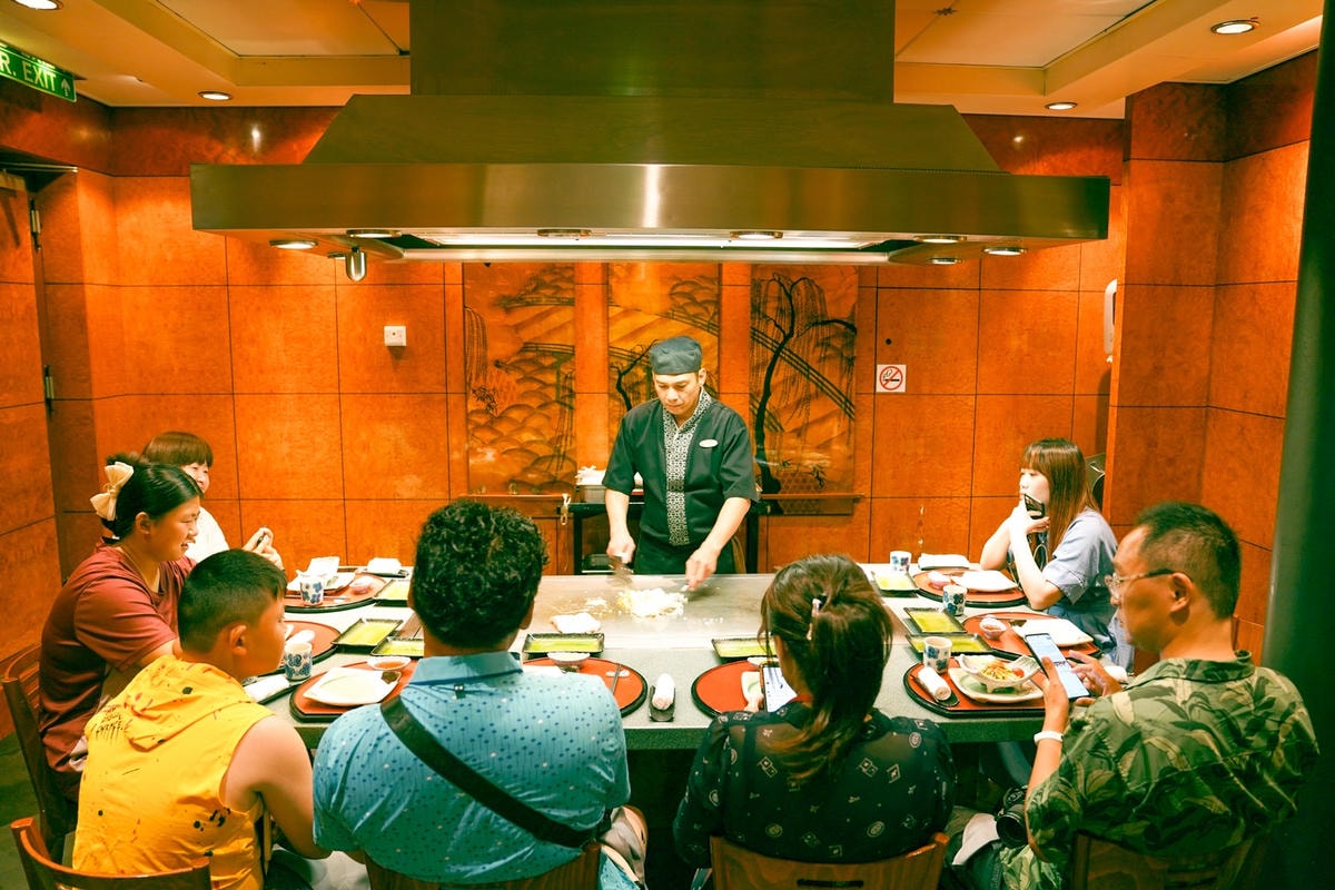 位在8樓的「海馬日本料理」是熱門付費餐廳之一,除了日式定食套餐及生魚片,建議來吃看看它的鐵板燒,不但充滿儀式感且主廚超有戲,把胡椒罐、雞蛋當成調酒在耍,種種花式拋接,外加各種英文諧音梗搞笑,逗得大家心花怒放,像是在參加Dinner Show超歡樂。